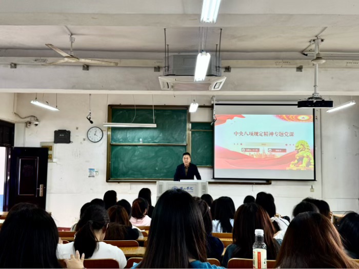 赵士德围绕中央八项规定精神的历史背景、核心要义及现实意义进行了系统阐述,强调作风建设是全面从严治党的关键环节,结合学院实际,要求全体党员以高度的政治自觉践行中央八项规定精神,筑牢思想防线,争做廉洁自律的表率。他详细解读了改进调查研究、精简会议活动、厉行勤俭节约等具体内容,指出作为新时代青年党员,必须时刻保持清醒头脑,坚决抵制形式主义、官僚主义等不良风气,将纪律要求内化于心、外化于行;同时通过典型案例警示全体党员严守纪律红线,在学业和社会实践中发挥先锋模范作用,以实际行动维护党的纯洁性。