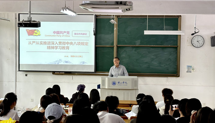 为开展深入贯彻中央八项规定精神学习教育,进一步加强党的作风建设,5月26日,金年会jinnianhuicom党委书记吴敏在教学楼1201教室讲授专题党课,教工第三党支部党员、学生第一、四党支部党员、第63期入党积极分子及青马班学员参加。