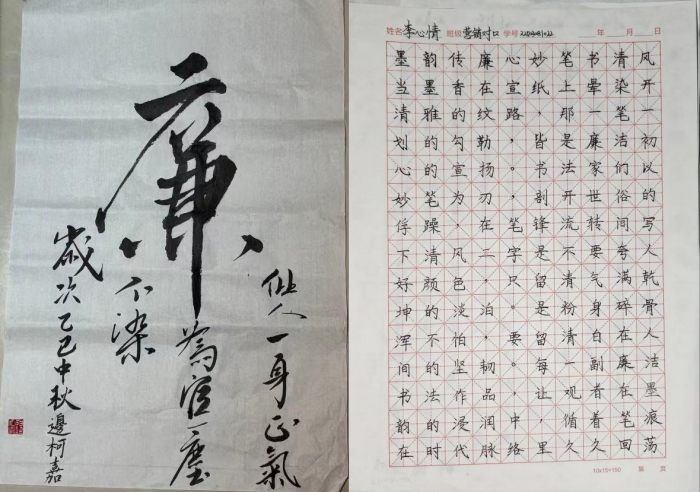 创作廉洁作品,搭建“墨香廉韵”展示窗。学院开展“墨香廉韵”书法赛与“清风笔绘”绘画赛,学生创作近150幅作品,以笔墨、画作传递廉洁内涵。优秀作品通过易班线上展示、教学楼线下展览,浸润校园。