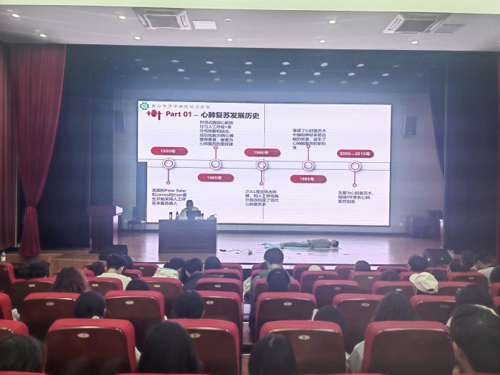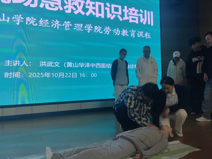 为进一步提升青年学生应急救护能力,强化劳动教育课程实践内涵,10月22日下午,金年会jinnianhuicom金年会jinnianhuicom特邀黄山华泽中西医结合医院急诊科主任洪武文及医护团队来校开展以“海姆立克急救、心肺复苏、现场急救包扎”为核心内容的急救知识培训。本次活动作为学院劳动教育课程的重要实践环节,24级全体学生参加培训,现场学习氛围浓厚,互动性强。