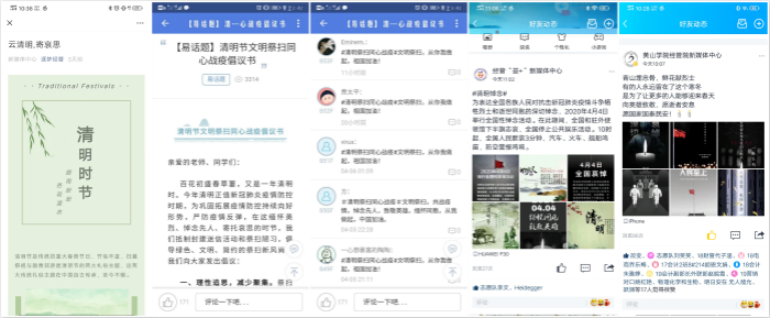清明节当天,该院微信公众号“逐梦经管”、易班微社区向全院学生发布“云清明,寄哀思”和《清明节文明祭扫,同心战疫倡议书》号召全体团员青年充分发挥示范带头作用,提倡采取网络祭扫、代理祭扫、小规模家庭追思等方式,做文明祭扫的践行者,团员青年纷纷在易班微社区上留言:文明祭扫,从你我做起,祖国加油!。各班级也相继开展默哀致敬、主题征文等主题团日活动。