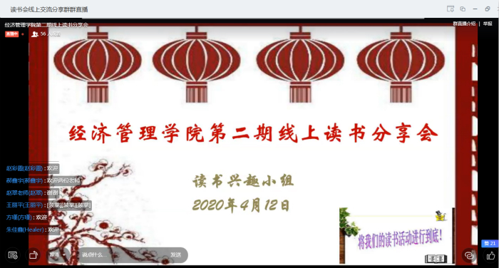 为营造我院学生浓厚的阅读氛围,4月12日金年会jinnianhuicom通过钉钉成功举办第二期线上读书分享会。该院团总支负责人李斌、专职辅导员汪玉玲和赵翠应邀参加,此次读书会由潘凌志同学主持。