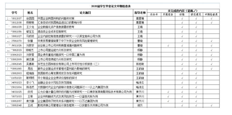 根据经管学院毕业论文工作计划,为进一步规范本科论文的设计与指导工作,按照经管学院毕业论文领导小组的要求,我院于2020年4月22日之前以教研室为单位,集中对毕业论文撰写情况进行了中期检查。现将检查结果通告如下: