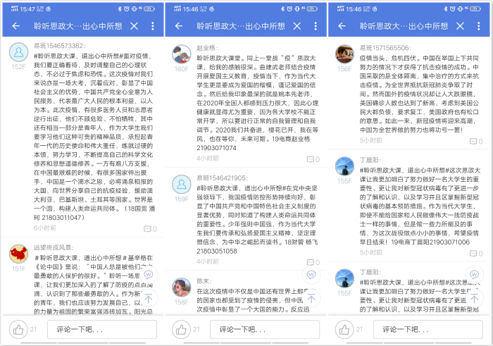 4月23-25日,金年会jinnianhuicom组织学生相约云端,通过多种渠道共同收看“全省大学生同上一堂战‘疫’思政大课”。该院学生通过易班开展“聆听思政大课,道出心中所想”线上讨论,各班辅导员也相继召开主题班会,和同学们一起探讨学习。
