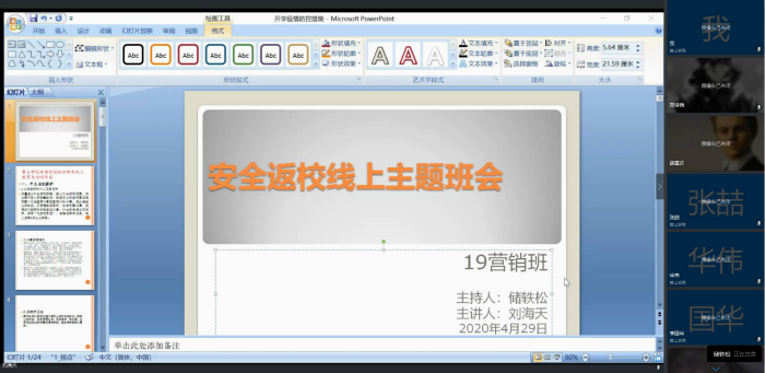 19营销班于4月29日晚7:00在钉钉APP上召开关于安全返校线上主题班会。