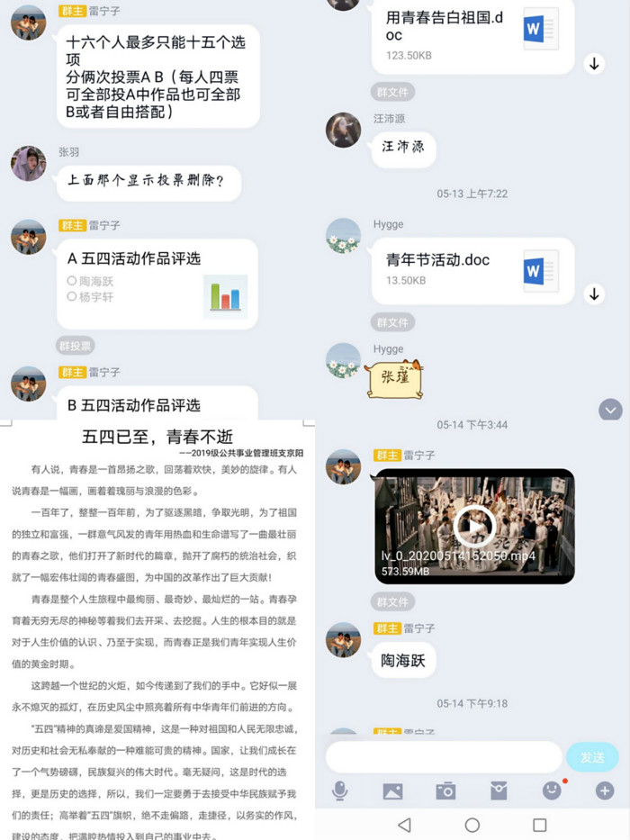 5月22日,金年会jinnianhuicom19公共事业管理班利用QQ平台召开“弘五四精神,担时代责任”主题活动。活动由辅导员赵老师牵头,各班委组织实施,19公共事业管理班级全体学生均积极参与。