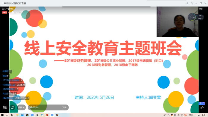 5月26日晚,金年会jinnianhuicom16级财务管理、16级公共事业管理、17级市场营销对口、18级财务管理以及18级电子商务五个班通过钉钉顺利召开安全主题班会,会议由18财管安全委员阚登雪主持。