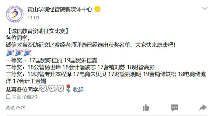 该院通过线上征集、评比的方式成功举办了学生资助诚信教育征文比赛,共有168名同学积极参与了此次活动。同学们在作品中讲述了自立自强的励志事迹,表达了对党和国家的感激之情,展现了端正的学习态度和积极向上的人生态度。经征文评审小组的评选,17国贸陈佳丽、19国贸朱佳鑫获得一等奖;17营销刘苏、18公管杨世峰、18会计潘凌志、18财管高影获得二等奖;17电商朱贝贝、17财管姚明明、17会计王金娟、18电商储流洋、19营销储轶松、19财管专升本程泽获得三等奖。同学们通过作品传递了诚信理念,为该活动画上了一个圆满的句号。