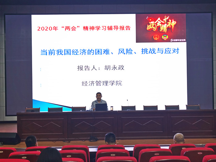 胡永政围绕2020年《政府工作报告》工作要点“稳就业保民生,坚决打赢脱贫攻坚战,努力实现全面建成小康社会目标任务”主题,结合专业知识,坚持用全面、辩证、长远的眼光看待当前的困难、风险、挑战,运用数据与案例分析了我国经济韧性强、经济潜力大与回旋空间足,提出了在习近平总书记为核心党中央的坚强领导下,我们有坚定应对当前严峻经济形势的信心。报告详细解读了做好“六稳”实现“六保”主要工作目标,并从当前主要宏观经济政策和“新基建”政策引领中国产业未来发展等方面分析中央当前经济应对之策。总后,胡永政指出,2020年注定是不平凡的一年,我们作为高校教育工作者,一定要谨遵习近平总书记教导,科学分析形势、把握发展大势,坚持用全面、辩证、长远的眼光看待当前的困难、风险、挑战,立足岗位,做力所能及的贡献,积极引导全社会特别是各类市场主体增强信心,巩固我国经济稳中向好、长期向好的基本趋势,用只争朝夕、不负韶华紧迫感,勠力同心,为完成2020年目标任务尽一份情,出一份力。