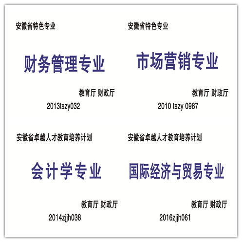 2019年学院财务管理专业获得为安徽省首批“一流专业”建设立项;2018年学院获批为安徽省首批“三全育人”综合改革试点单位。学院建成有2个省级特色专业——财务管理和市场营销,2个省级卓越人才培养计划(1.0版)专业——国际经济与贸易专业和会计学,1个省级综合改革试点专业——公共事业管理专业,1个省实验实训示范——济管理综合实验(实训)中心和3个省级教学团队——管理学、财务管理和国际经济与贸易等。