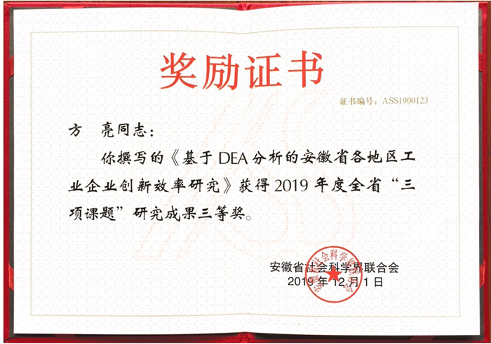 方亮《基于DEA分析的安徽省各地区工业企业创新效率研究》获得2019年全省市级社科联三项课题研究优秀成果三等奖