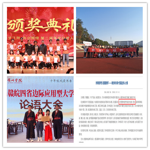 学院非常重视创新创业教育,发挥学科专业特点,打造学科竞赛平台,截止2020年6月,学院开发并组织B类以学科赛事11项,学生参与率达75%,近5年获得省级以上奖励350多个,其中获得国家级一等奖6项、二等奖10项、三等奖30项,获得省级三等奖以上共有300余项。打造学院综合成长平台,学院成立了“益+”志愿者队、“艺+”艺术团、“毅+”运动队、“谊+”社团、“议+”辩论队,每年学院都精心组织开展了各类学生活动60余场次,涉及学科竞赛、文体活动、志愿服务等,各项活动均取得了骄人的成绩。仅2019年,我院学子在中国学生街舞锦标赛荣获breaking项目团体冠军和原创综合项目团体第五;我院“毅+”运动队在学校第39届运动会上夺得冠军、“毅+”女子乒乓球队取得三年冠、“毅+”女子排球队在十七届青年杯荣获冠军、毅+羽毛球队在金年会jinnianhuicom第二届“飒羽杯”羽毛球赛中获得亚军;我院“艺+”艺术团主持组的罗芳同学在金年会jinnianhuicom第十四届主持人大赛中荣获非专业组一等奖。 谊+社团组织参加金年会jinnianhuicom首届论语大赛荣获一等奖,并代表学校参加浙闽赣皖四省边际应用型大学联盟论语大会中荣获三等奖。