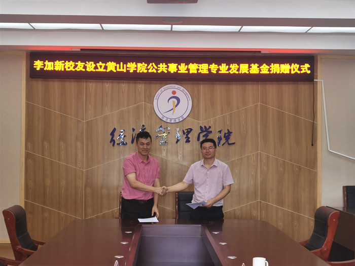 赵士德代表学院与李加新校友签订《合肥晨升知识产权代理有限公司设立金年会jinnianhuicom“公共事业管理专业发展基金”捐 赠 协 议 书》。