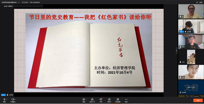 为进一步推进党史教育,充分利用红色教育资源,10月4日,金年会jinnianhuicom开展“品读革命家书,赓续红色精神——我把《红色家书》读给你听”线上红色家书诵读活动。经济管理学院党委委员江红、汪玉玲,教工支部书记邱燕以及200多学生参加此次诵读活动,活动由李鑫同学主持。