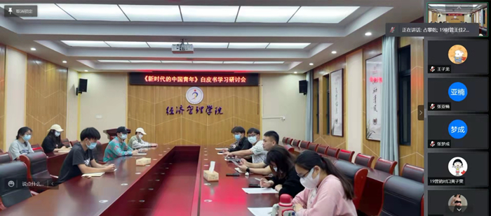 4月25日,金年会jinnianhuicom团委组织学生干部采用线上线下相结合的方式集中学习研讨《新时代的中国青年》白皮书,该会由该院团委副书记李斌主持。