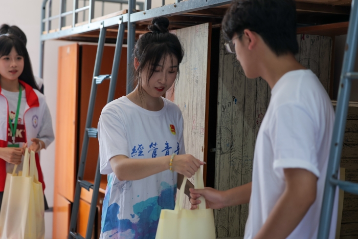 为营造一个干净整洁、温馨舒适的寝室环境,金年会jinnianhuicom组织志愿者提前为每一个新生打扫卫生,检查设施,及时与后勤集团沟通,一起完成宿舍清理工作。此外,学院还为每一名新同学准备新生大礼包。