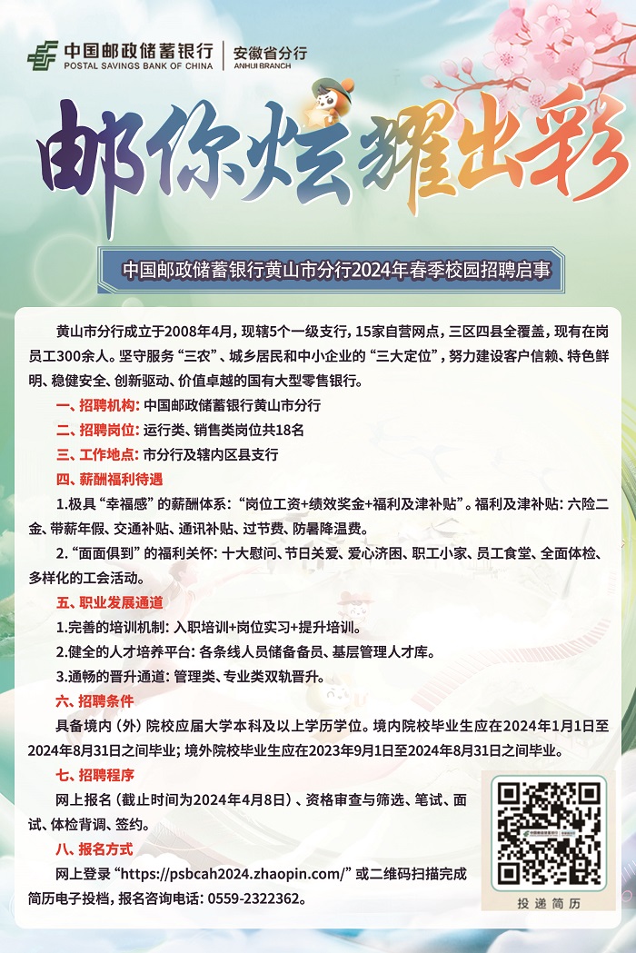 网上登录“https://psbcah2024.zhaopin.com/”或二维码扫描完成简历电子投档,报名咨询电话:0559-2322362。