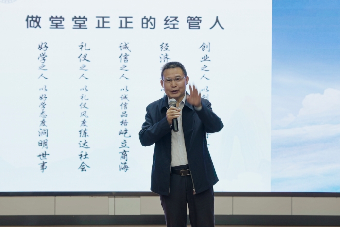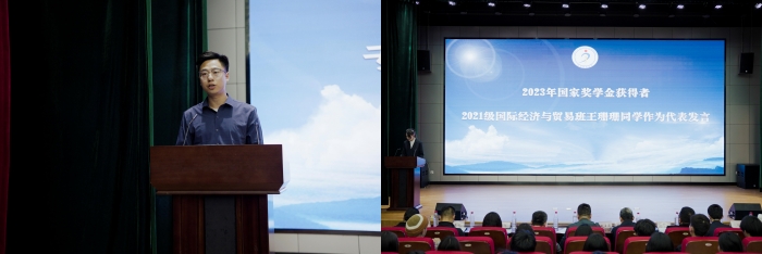 2023年国家奖学金获得者2021级国际经济与贸易班王珊珊、教师代表吴伟航分别作了交流发言。