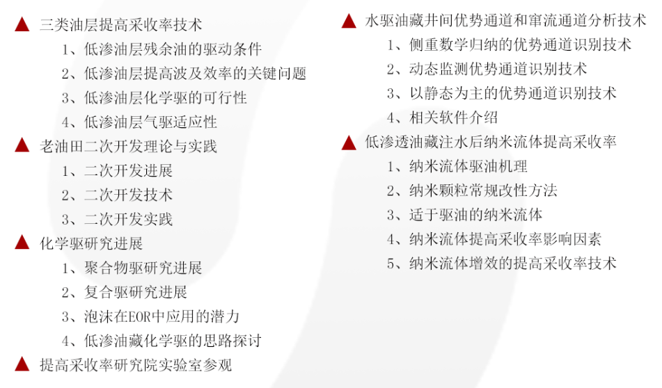 中国石油大庆油田三次采油提高采收率一体化开发技术培训班是中国石油天然气股份有限公司的重点培训项目,培训学员为大庆油田采油单位和科研单位负责三次采油的总地质师、总工程师、技术专家、油田开发业务骨干。通过开展精准地质研究、聚驱后新一代提高采收率技术、三类油层三次采油技术,以及三次采油油藏工程、采油工程、地面工程配套技术等专项培训,学员拓宽了视野,将学习的知识运用到生产实际中。