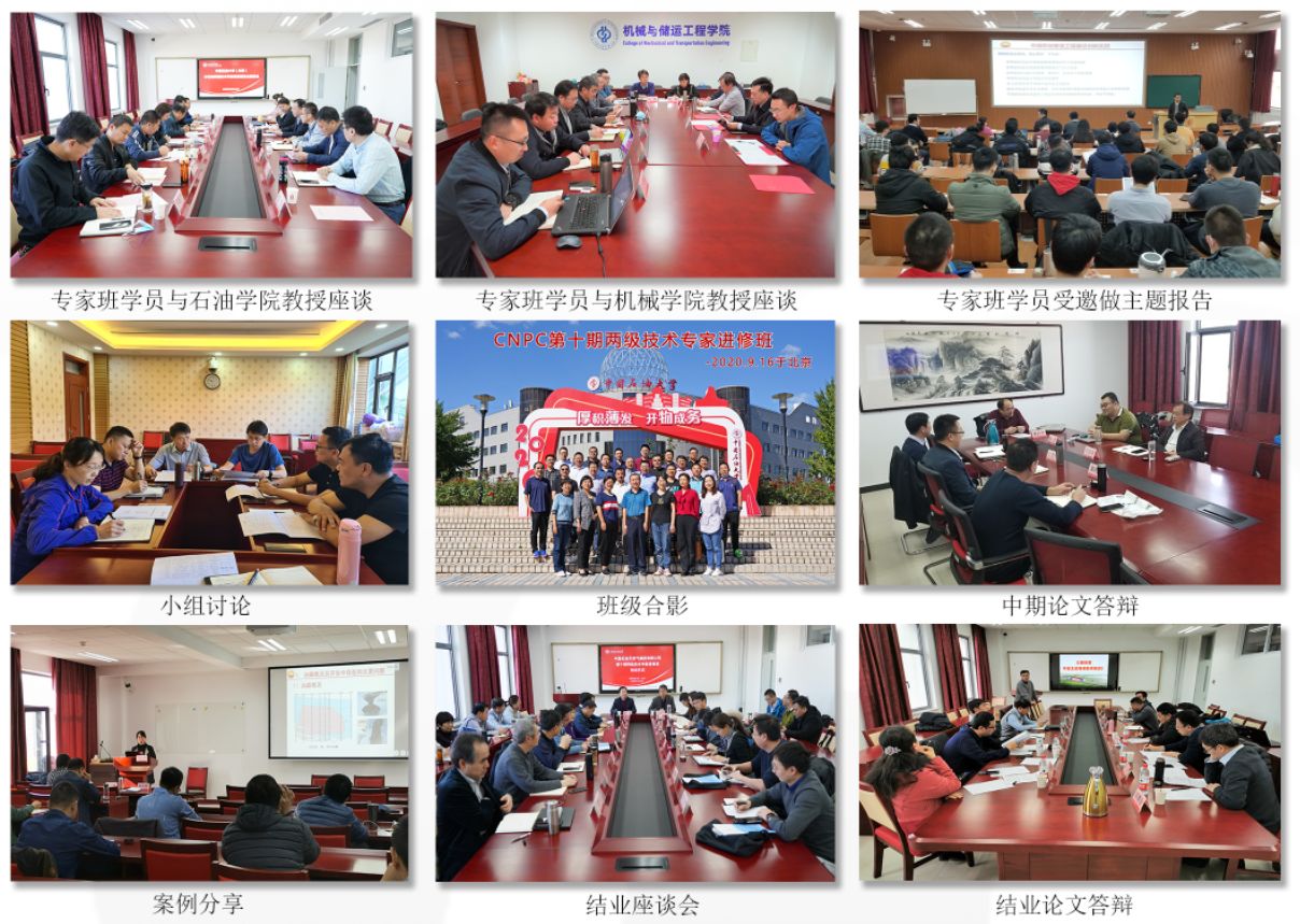 CNPC第十期两级技术专家进修班进修期间,进修专家与我校教授联合开展科技攻关项目11项,已确定(或有意向)的合作项目2项,解决生产技术难题10个,企业技术转化革新成果5个,申报专利5个,发表科技论文15篇,起草修订标准6项,获得奖励5个。在校期间,进修专家为我校开展企业专家技术交流63次,在我校推广企业创新成果45个。