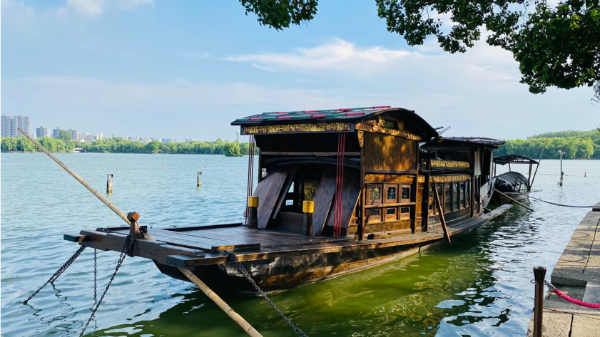 下午,实践团成员在会景园乘船来到了湖心岛。顺着小道阶梯一路下行,来到岸边,便见到了停泊在湖边的充满历史气息的红船遗址。停靠在南湖湖畔边的红船像是一位饱经风霜而依旧屹立的革命志士,见证了中国革命命运的历史时刻。在这里,大家饱览建党伟业,再一次感受到了“红船精神”的熏陶,心中涌起无尽的崇敬之情。接着,梁硕老师带领实践团成员合唱了原创歌曲《啊!红船》,用歌声传递红船情,表达对中国共产党辉煌历程的纪念。激昂的旋律在湖面上回荡,仿佛带领大家回到了百年前的那个时空,与这条小船进行着对话,实现了百年文化的交融。一艘小小的红船,承载人民的重托,民族的希望,在103年后的今天,已成为领航中国行稳致远的巍巍巨轮。