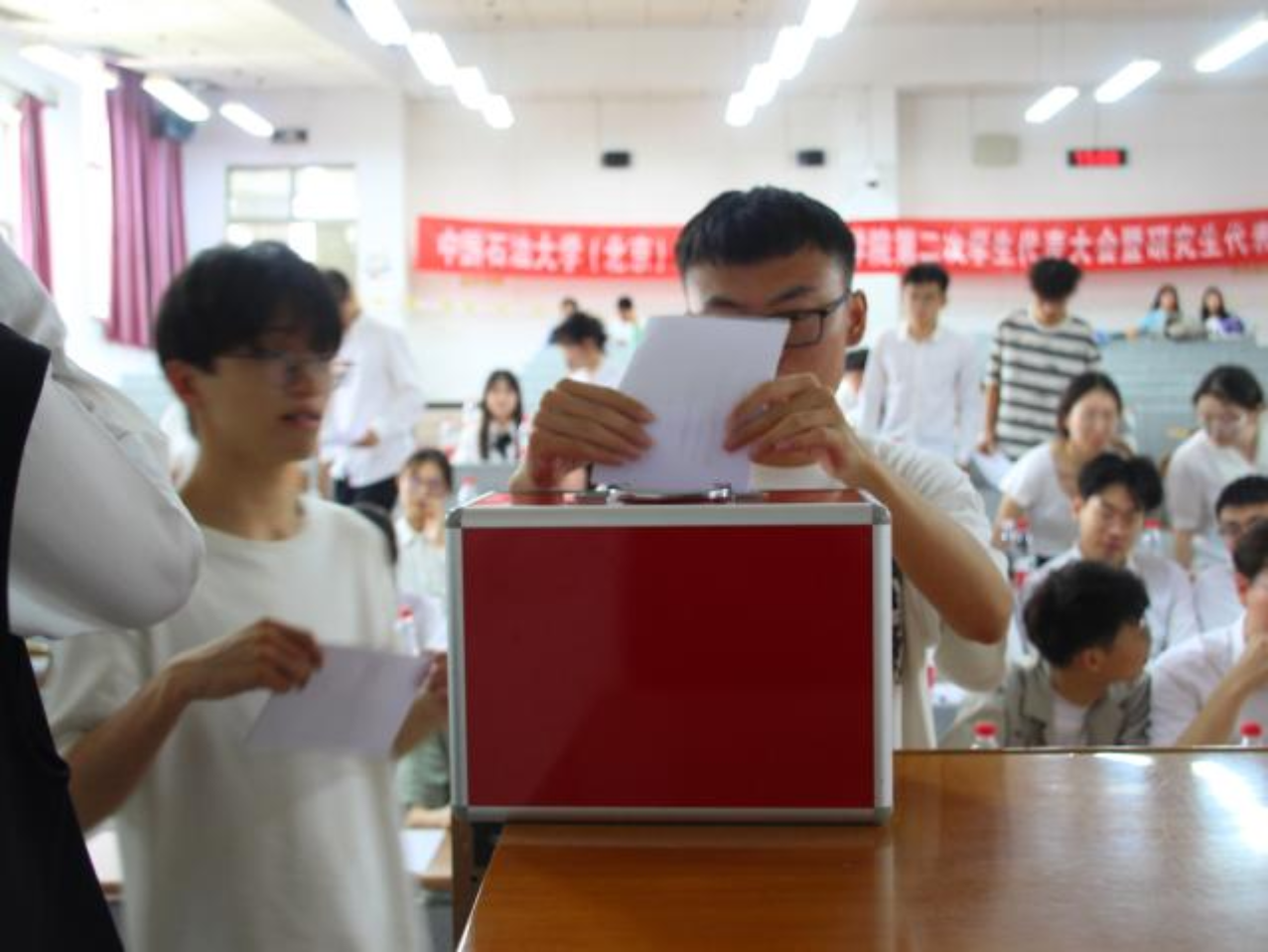 本次选举由学代会代表进行投票,计票人统计,监票人监票并宣读投票结果。