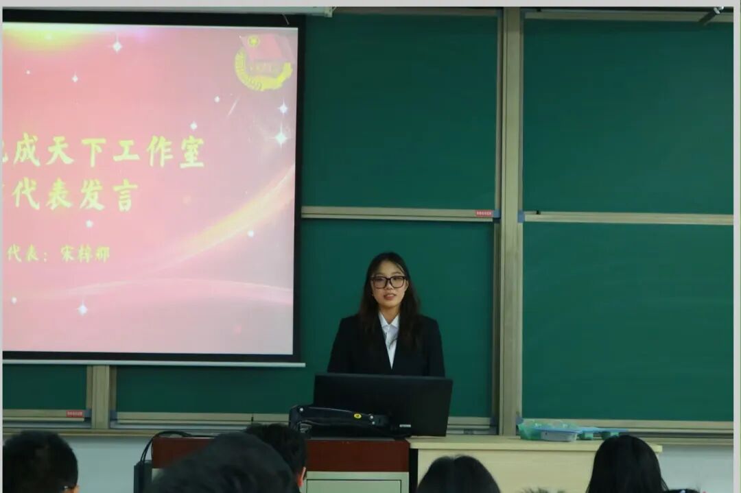 第六届“化成天下”工作室主席团成员宋梓郡在发言中表达了对工作室未来发展的美好期许。她感谢各位老师和同学的信任与支持,并表示新一届主席团将继承工作室优良传统,勇于创新,带领全体成员开创工作室新局面。