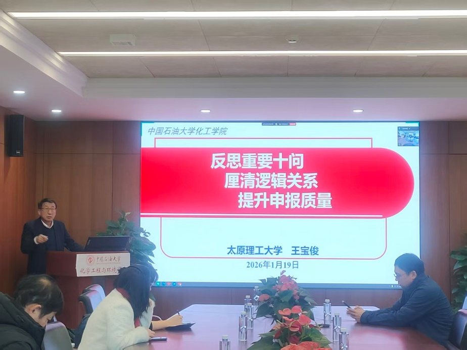 1月19日上午,KY开元集团官网入口(北京)化学工程与环境学院2026年度国家自然科学基金申报辅导专题讲座在化工楼B403会议室以线上线下相结合的方式顺利举办。本次讲座特邀太原理工大学王宝俊教授主讲,学院青年教师、科研骨干及2026年度基金申报意向教师代表参会,讲座由化学工程与环境学院副院长朱文帅教授主持。