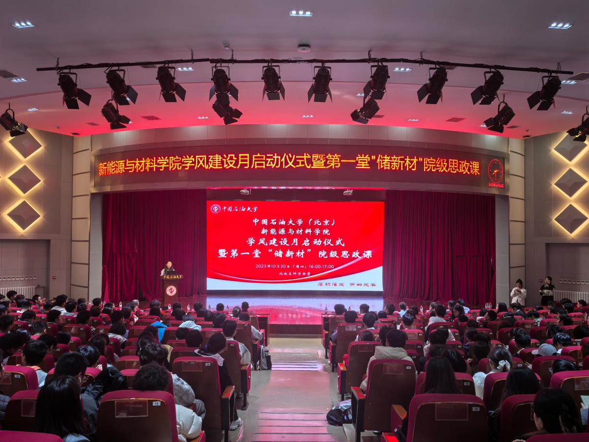 2025年10月30日下午,新能源与材料学院在北校园科学会堂举行“新能源与材料学院学风建设月启动仪式暨‘储新材’院级思政课”。学院党政领导、各系负责人、教师代表及全体新生共同参加了本次活动。正式拉开本学年学风建设月序幕,深入推进“学在中石大”行动计划。