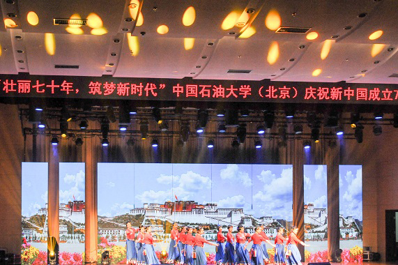 演出在管弦乐合奏《红旗颂》中拉开帷幕,整场文艺演出共16个节目,石大与附中附小师生呈现了一场气势恢宏的爱国主题乐章。稚嫩且英姿飒爽的小铁梅,舞姿灵动的翠竹生生,热情洋溢的啦啦操,展现了师生爱校、爱党、爱国的情怀。合唱《不忘初心》《我和我的祖国》把晚会推向高潮。演出在全场合唱《我为祖国献石油》中落下帷幕。