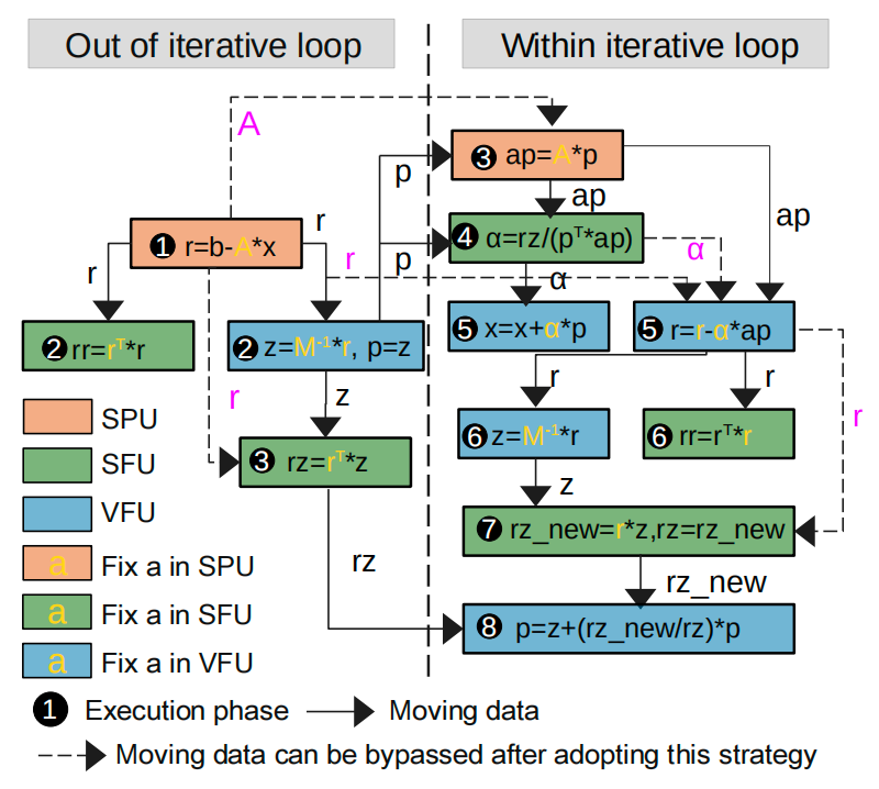 最后,我们对算法每个步骤中的标量、向量和矩阵依赖关系进行了详细分析,并制定了新的数据流调度策略,如图3所示。我们发现阶段内操作可以并行执行,整个架构中的模块也具备并行执行能力,从而提高了并行性,加速了算法的执行过程。同时,我们减少了数据搬运次数和写次数,尽可能地减少ReRAM写耐久性差对加速算法的影响。