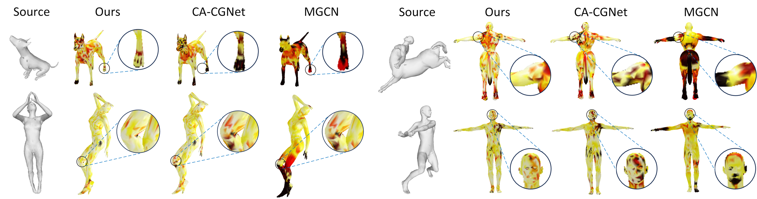 图5 不同方法中人体模型和非人体模型测地线误差可视化