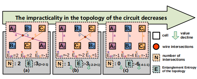我们展示了定义的纠缠熵可有效的用于电路拓扑的初始化过程。图1展示了三个不同的电路拓扑示例,可以观察到随着拓扑结构中交点个数(N)的减少,电路的布局效果逐渐提高。同时,我们还展示了纠缠熵这一指标与交点的数量紧密相关,且利用纠缠熵(E)的变化来优化初始布局要好于直接使用交点个数(如图2所示)。