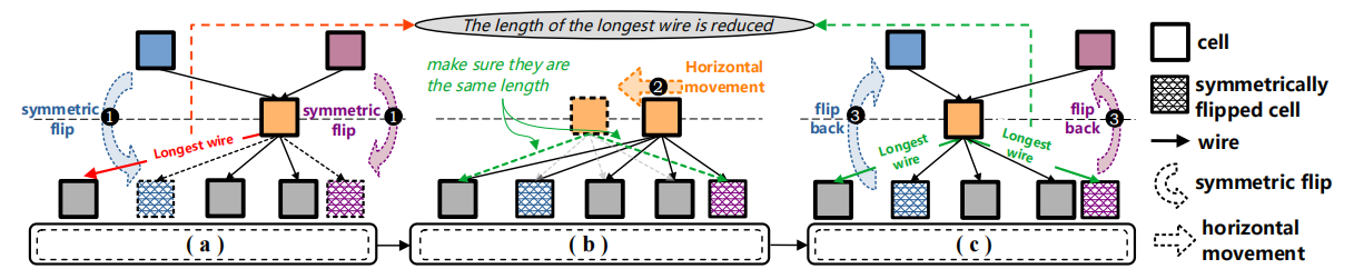 初始状态下,两个单元通过一条可能超出最大布线长度约束的长布线相连。为简化问题,我们采用基于投影思想的对称翻转方法,将某单元相邻的两行单元沿着单元所在的轴线对称地“翻转”到同一行上,同时保持布线长度不变。此步骤为理论操作,实际布局中不执行翻转。在对称处理的基础上,通过水平移动将单元移至中间位置。