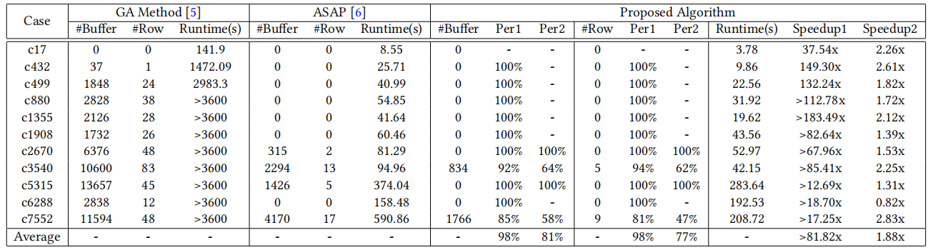 表1展示了用于评估所提出的AQFP逻辑电路布局算法的测试例的详细信息,包括每个电路的名称(如c17、c432等)、单元数量(从7个到7552个不等)以及所需缓冲器数量(从7个到3256个不等)。这些数据反映了测试例在电路规模和缓冲器需求上的多样性,为验证算法在不同规模和复杂度下的有效性提供了全面的基准。