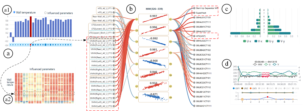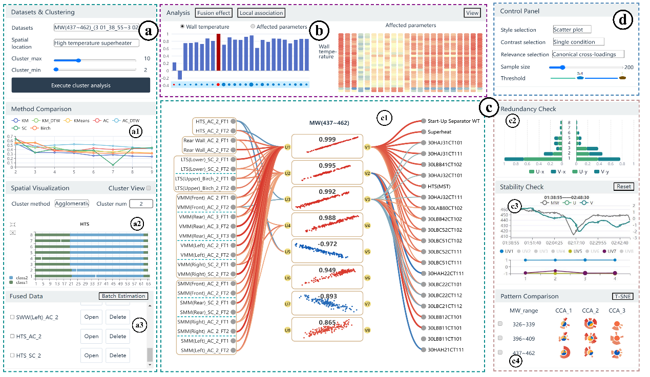 在现代工业控制系统中,常常需要布置大量高密度传感器来监控大型复杂设备的运行状态。例如,在火力发电厂中,不同区域分布的高密度温度传感器生成的大规模壁温数据代表了炉膛内不同部分的燃烧特性,并对一系列后续控制参数(如蒸汽压力和温度等)有着重要影响。通过揭示这些壁温和后续控制参数之间的相关模式,操作人员可以更精确地调整锅炉的运行状态,以提高设备运行的安全性和经济性。然而,这些众多监控参数与随后的受影响参数之间的关联机制和随机性复杂,并且每个工况下都有其独特的运行特性和控制规则,这使得有效分析这些不同类别参数集之间的相关性变得非常困难。典型相关分析(CCA)可以用来探索这种多对多的关系,通过生成较少数量的复合变量来表示两个变量集之间的全局关联。但是这种方法的内部计算过程和结果复杂,难以直观理解和评估。为此,本文将交互式可视化技术引入工业参数相关性分析过程中,重点解决三个方面的研究挑战:(1)大规模高维传感器数据的灵活融合处理;(2)不同类别工业参数之间典型相关性的全面表示和评估;(3)不同工况下工业参数典型相关性模式的交互比较。