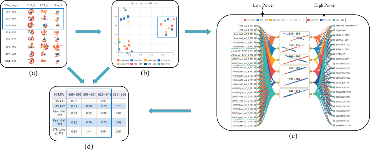 多工况下,专家更关注典型相关模式的差异。通过图7a中符号对比,发现高功率工况(569-645MW)下第一列符号高度相似,而低功率工况(339-409MW)下所有列均相似度较高。查看多符号散点图(图7b),专家发现第一个关系模式具有一般性,受功率影响小,第二和第三个关系则更独特。选择三个符号相似的工况(569-595MW、595-604MW和626-645MW)进行详细比较,发现原始参数对第一个典型模式的贡献值无显著差异(图7d)。此外,高功率和低功率工况下典型变量的值分布相反(图7c),专家猜测壁温在这两种工况下对后续控制参数(尤其是“过热度”)产生相反影响。