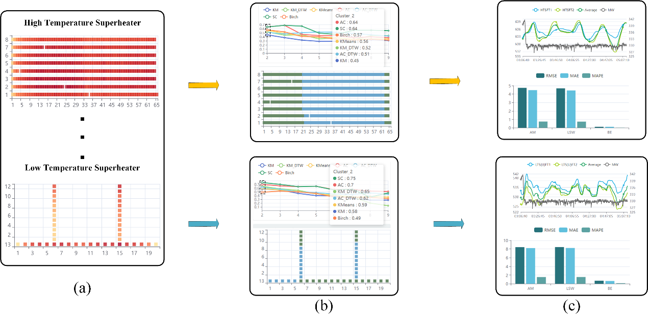 在进行CCA之前,领域专家需要全面理解和评估多传感器数据融合结果。以功率范围326-339MW的工作状态为例,图5展示了锅炉中高温和低温过热器部位的多传感器数据交互融合过程。首先,图5a可视化了原始测量点的空间位置,并用颜色映射平均壁温,显示高温过热器的中部和低温过热器的下部区域温度较高。其次,专家通过比较轮廓系数选择了层次聚类(AC)和谱聚类(SC)作为最佳分类方法,聚类结果与温度分布一致(图5b)。最后,分批估计融合结果在RMSE、MAE和MAPE方面显示出比其他方法具有更小的误差值(图5c)。专家通过观察特征变量和原始测量点平均值的时间变化,发现它们的波动存在明显差异,表明这些特征变量能够有效反映同一区域内不同的温度分布特征。