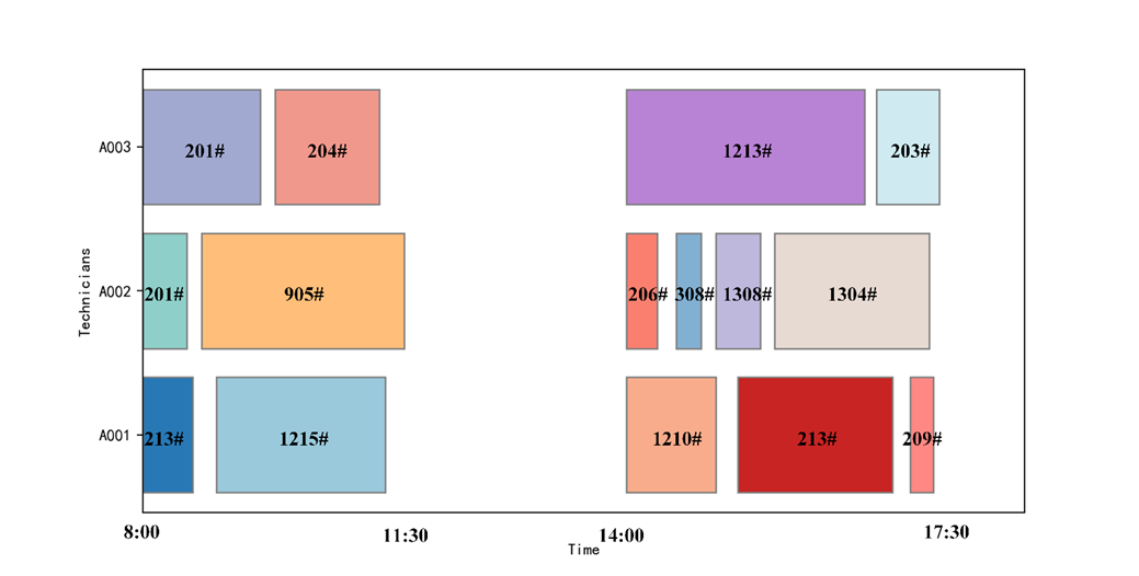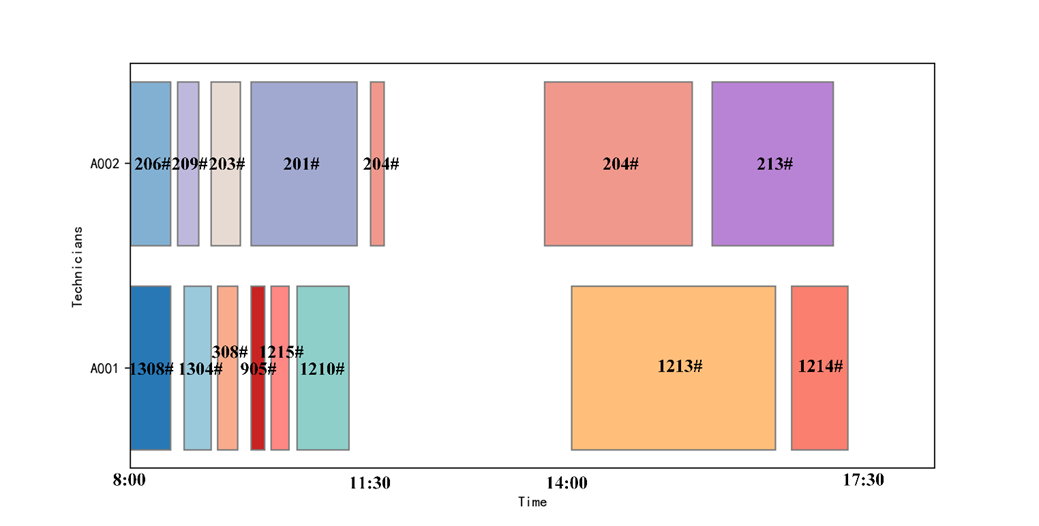图4显示了另一个现场应用结果,其中实现了两层优化策略。现有技术人员2人,其中高级技术人员1人,初级技术人员1人。重要任务23项,一般任务16项,紧急任务2项。为了便于区分,不同的数字和不同的颜色代表不同的实际井簇。每个集群有多个任务,属于同一集群的任务在图4中用相同的颜色表示。