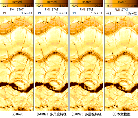 可以看出,使用Encoder-Decoder模型与UNet模型进行填充时,填充痕迹较明显,填充边缘层理连续性较差,空白带的填充内容的不够清晰自然,总体视觉效果较差;使用本文所提填充模型进行空白带填充后的成像结果填充痕迹基本消失,填充的空白带区域更清晰自然,总体视觉效果最佳。去除单个特征模块后,空白带填充区域会存在不同程度的模糊区域,同时增加多尺度与多层级特征模块时空白带填充区域更自然连续。