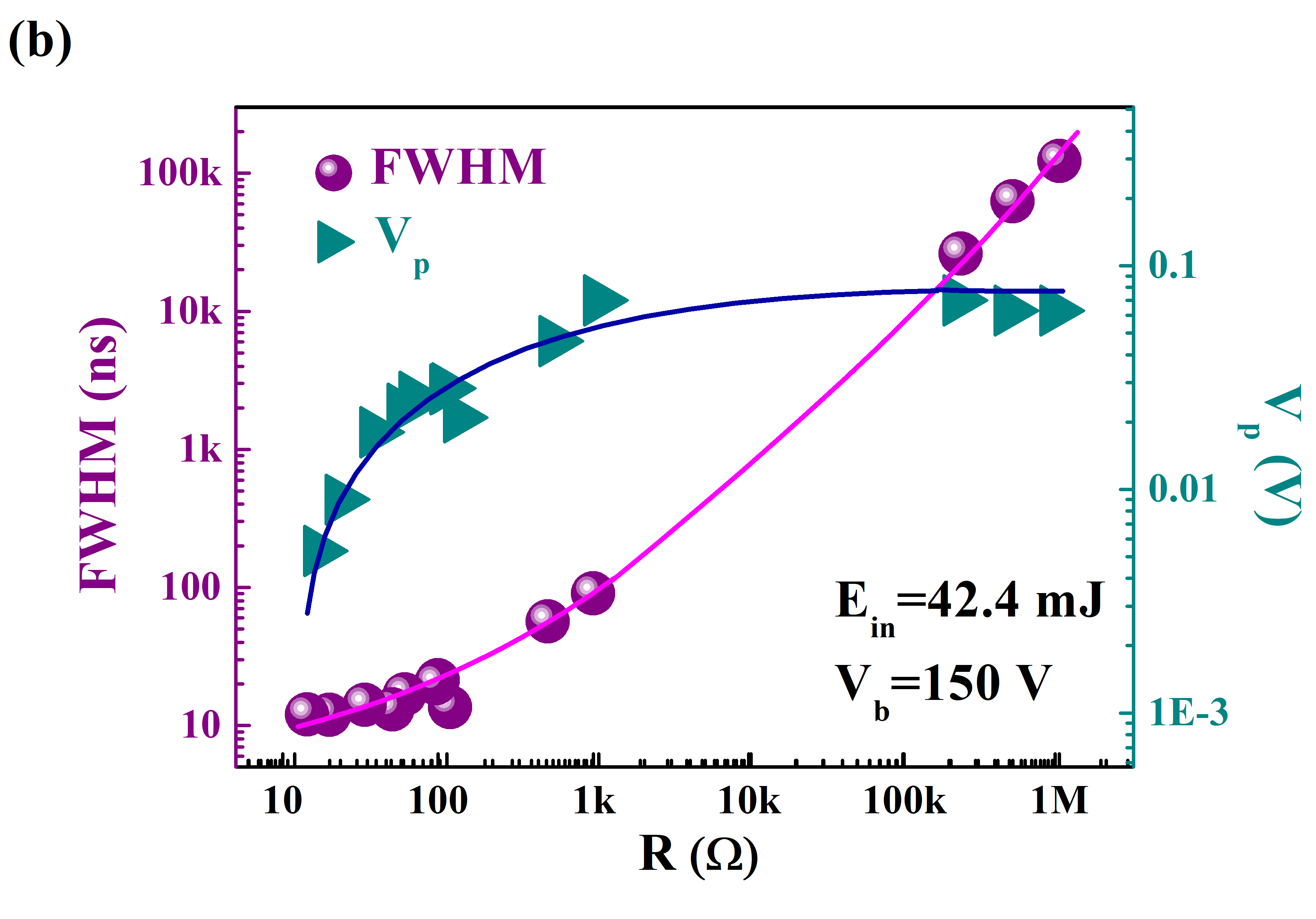 图2显示了LIV随外接负载R的变化情况,受检测电路阻抗的影响,信号的半高宽(FWHM)和峰值Vp均与R呈正相关。
