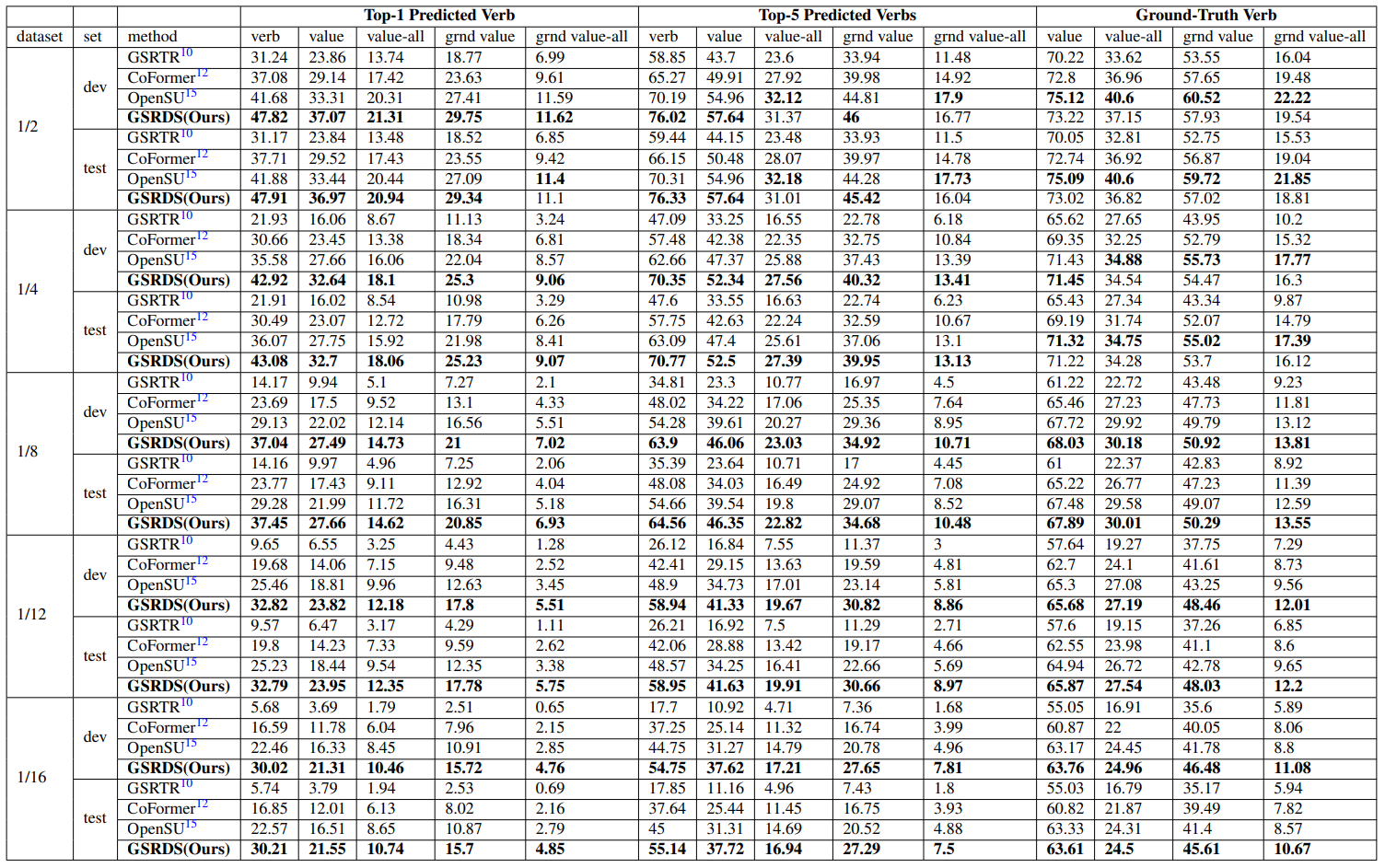表1的结果展示了在五种不同规模数据量的设置下,GSRDS与其他三个模型在14个指标上的对比结果。我们针对其中5个关键性指标绘制了折线图如图2所示,(a),(b)和(c)图分别代表在Top-1 Predicted Verb设置下verb , value 和grnd value 指标在五种数据量级上的实验结果;(d)和(e)图代表在Ground-Truth Verb设置下value 和 grnd value指标在五种数据量级上的实验结果。可以看出,随着数据量的量级减小,GSRDS模型的优势愈发明显。表2展示了消融实验结果。