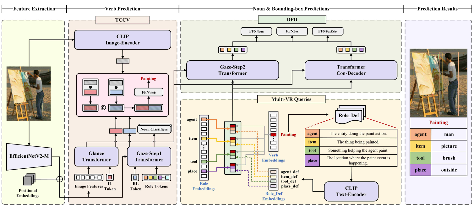 我们在SWiG数据集上利用随机抽样策略,构建了原数据集1∕2、1∕4、1∕8、1∕12和1∕16数据量的小规模数据集以用于模拟数据稀缺的场景。本文提出的GSRDS模型架构如图1所示,主要包括三个部分:图像特征提取,动词预测,名词及边界框预测。GSRDS利用EfficientNetV2-M提取图像特征并与位置编码相加作为输入。TCCV模块利用Transformer和CLIP编码器提取的特征对动词进行分类。Multi-VR Queries模块融合了动词、角色及其定义作为对象查询,与Glance Transformer输出的聚合图像特征一起作为DPD的输入。DPD包括Gaze-Step2 Transformer和Transformer Con-Decoder,用于预测语义角色所对应的名词和边界框,它们的输出将会被取均值,然后输入到三个前馈网络(FFN)分支中得到预测的结果。