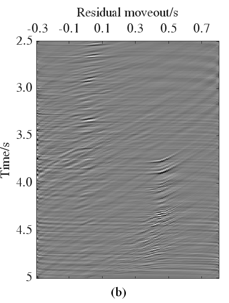 (a)反演的Radon域系数;(b)本文方法估计的多次波Radon域系数