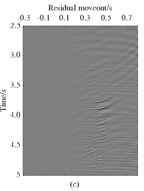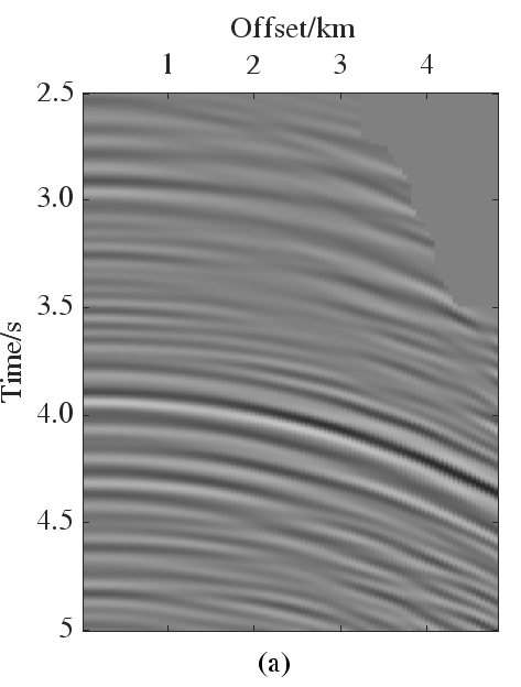 为验证本文方法应用效果,对某实际数据集进行多次波压制实验。图2a是其中一个CMP道集,图2b和2c分别为最小二乘法估计的Radon域系数和本文方法滤波后的多次波Radon域系数。容易观察到,本文方法可对扩散的多次波能量逐渐衰减。