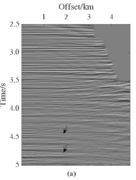 图5a和图5b分别展示了高分辨率方法和本文方法得到的一次波剖面。高分辨率方法估计的结果中仍有明显的多次能量未被压制掉,如黑色箭头所示,而本文方法多次波残留较少,多次波压制更彻底。
