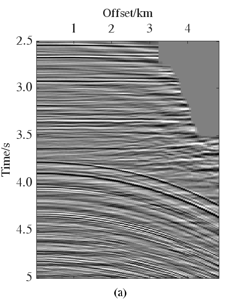 进一步对叠加剖面进行分析。原始数据叠加剖面如图6a所示,在4.0 s和4.3 s附近可以看到明显的多次波。图6b和6c分别是高分辨率方法和本文提出方法压制多次波后的叠加剖面。在高分辨率方法中仍有明显的多次波残留,如黑色箭头所示,而本文方法的处理结果中几乎看不到多次波残留。这说明,本文方法有更好的多次波压制效果。此外,高分辨率方法用时1433.79 s;而本文方法仅用时371.15 s,大大降低了计算成本。