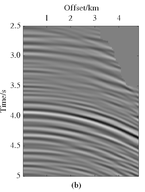 这一平滑过渡得益于频域的平滑滤波。图3a为频域的Radon域系数,频率越低,一次波和多次波混叠越严重,但从图3b所示的滤波结果可见,本文方法可根据不同频率的混叠程度估计多次波能量,实现了频变平滑滤波。