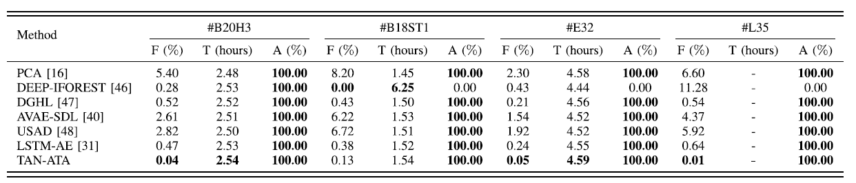 传统模型与本文方法的各项回归评价指标比较如表1所示,其中每个测量结果为10次重复的平均值。一般F(%)越小,T(hours)越大,A(%)越大,说明预测越准确。很明显,所提出的TAN-ATA在F(%),T(hours),A(%)优于其他对比方法,证明了其优越性。