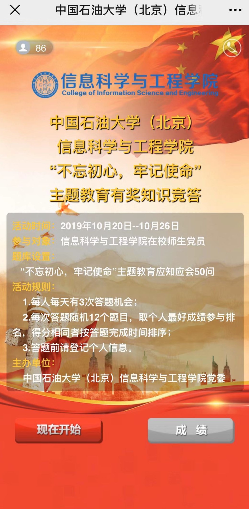 为更好贯彻 “不忘初心、牢记使命”主题教育的精神,深入学习十九大报告和习近平新时代中国特色社会主义思想,把学习教育贯穿始终,10月20日至10月26日,学院党委面向学院全体党员开展“不忘初心、牢记使命”主题教育网络知识竞赛,在学院师生党员中间掀起学习答题热潮。